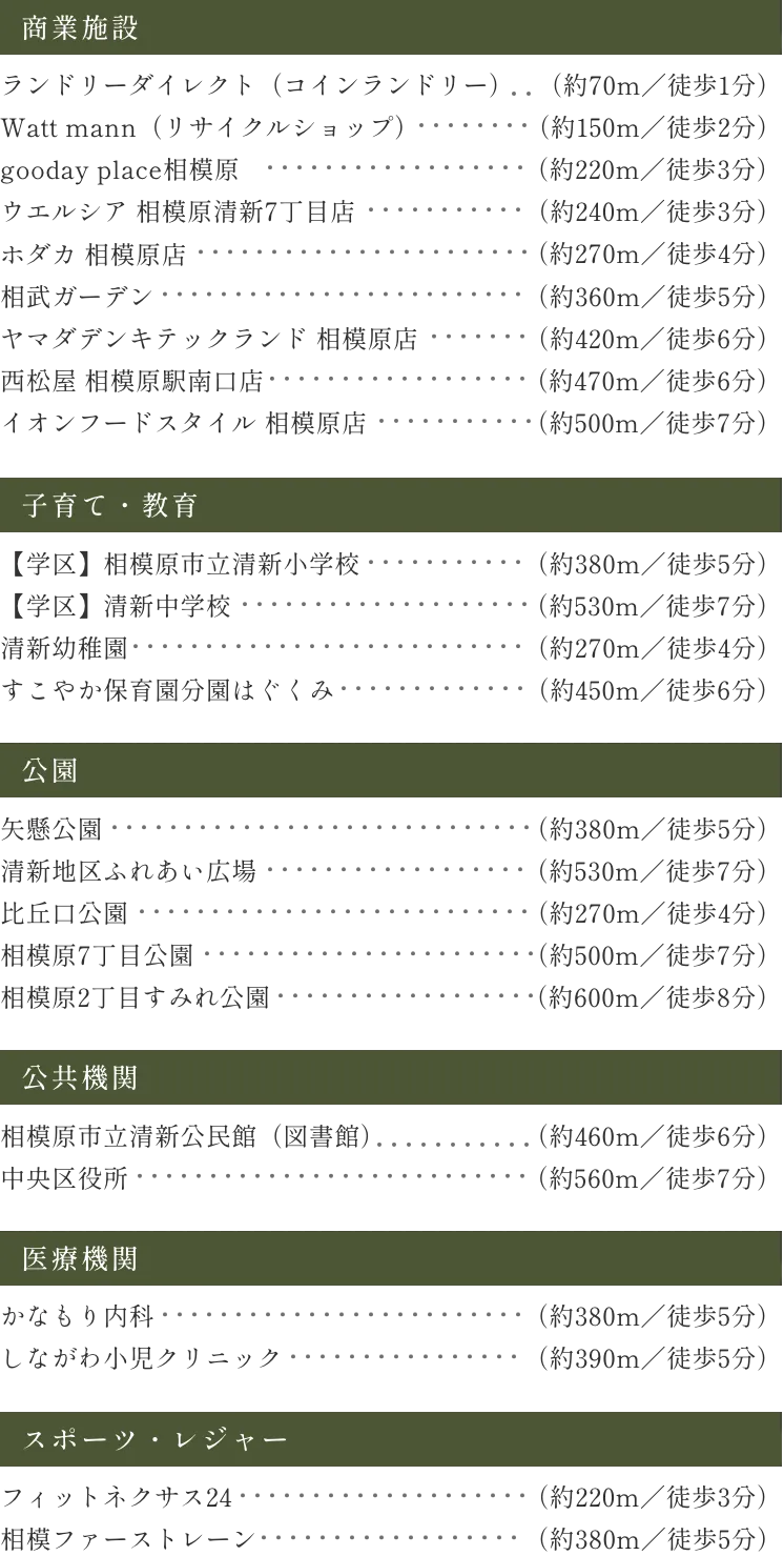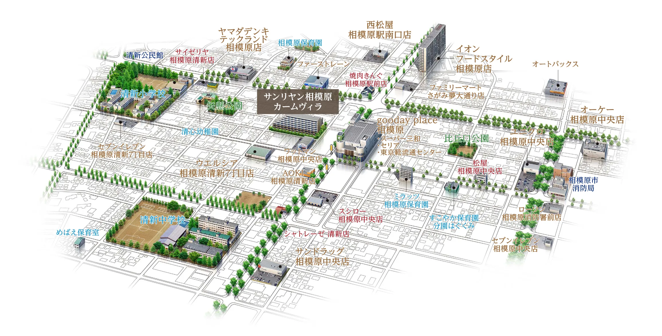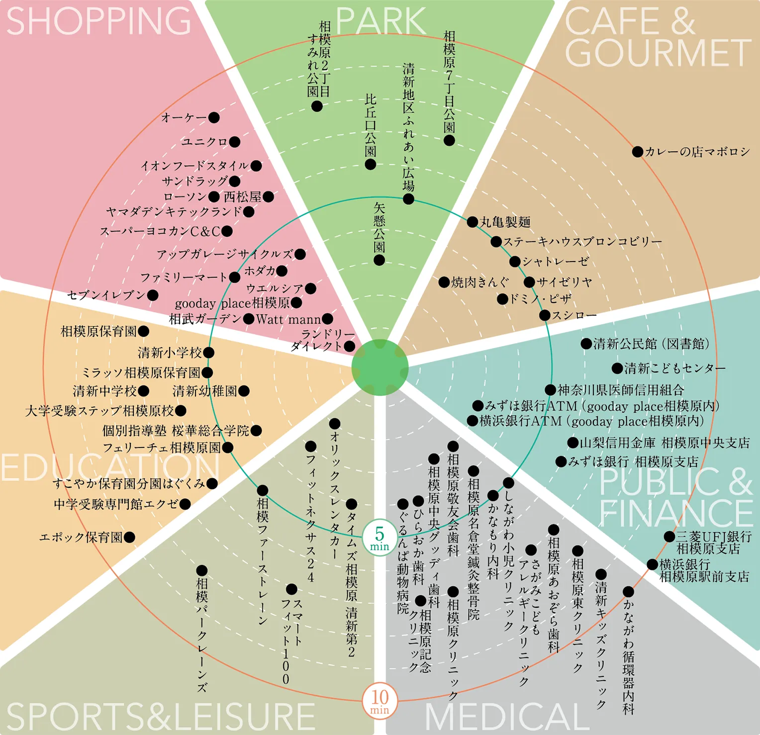 日々の暮らしが、この街だけで完結する利便性の高いロケーション。 買い物も、通学も、通院も、そして遊びの時間も。 生活に欠かせないすべてが徒歩5分圏内にそろった、家族にやさしい住環境となっています。また、本物件が位置する「相模原台地」は、相模原市中央部に広がり、 自然災害リスクへの配慮という観点でも、住まい選びの安心材料のひとつとなります。