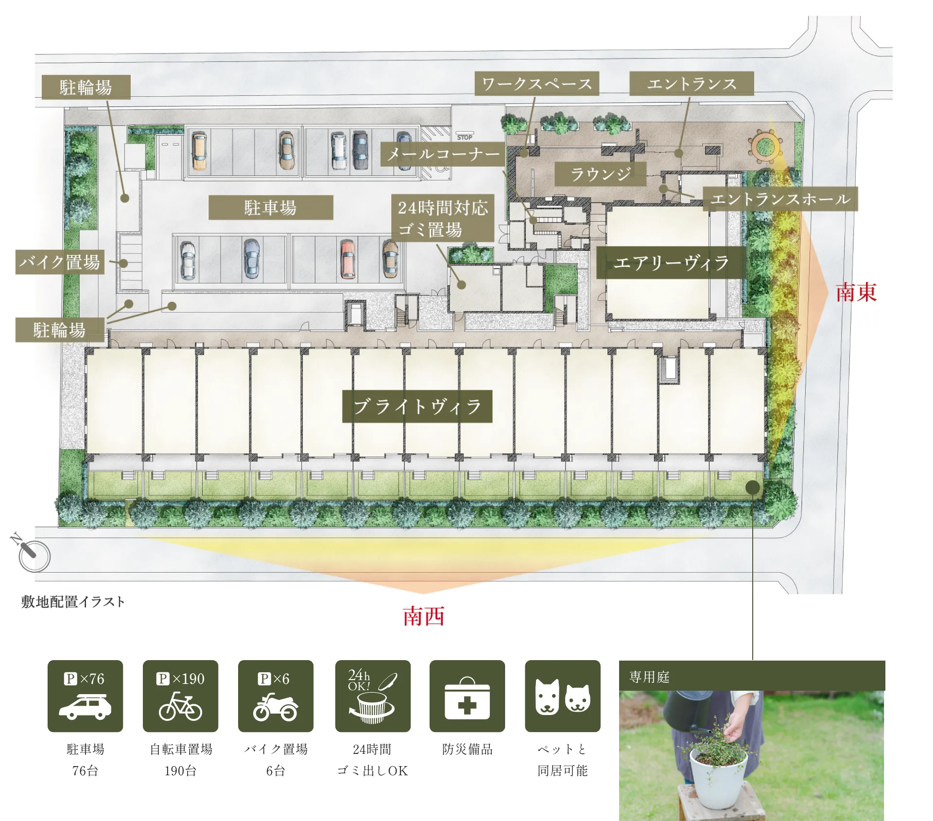 ※植栽は、特定の季節やご入居時の状態を想定して描かれたものではありません。計画段階のものであり、樹種等が変更になる場合がございます。